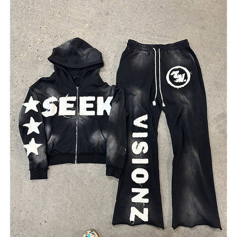 מותאם אישית צרפתית טרי בציר מכנסיים & קפוצ 'ון 2-קטע חומצה נשטפה שחור במצוקה לגברים מלא zip סגנון מלא